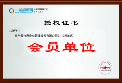 泰州戴特思企业管理服务有限公司是江苏专业的市场调研公司,通过一起调研网_市场调研门户网认证,正式成为一起调研网江苏地区会员企业。